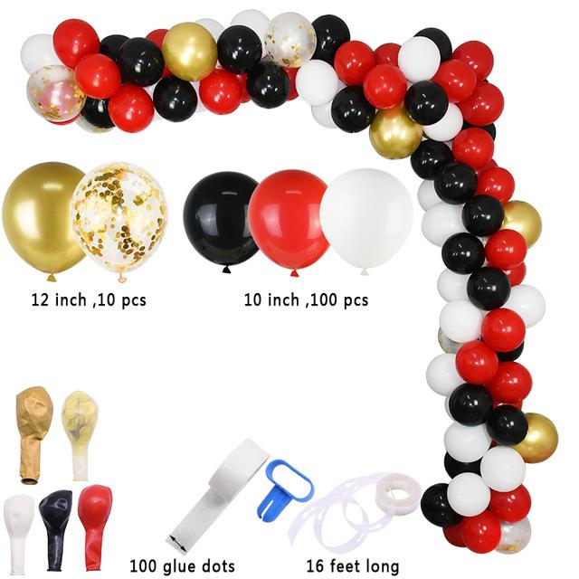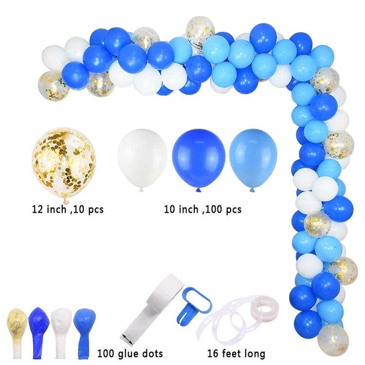 - Party Decoration Kit inches 100 pcs Latex Balloons, 12 inches-10 pcs Confetti Balloons, tying tool, 16′ ft arch tape strip and 100 glue dots.