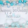 - Package Includes pack of 50 (White, Light Blue and Sea Green) Latex Balloons & Happy Birthday Scripted Silver Foil Balloon {Size: happy (45cmx85cm) & birthday (45cmx124cm)} & Pack of 5 (Light Blue) Confetti Balloons and 5 Silver Chrome Balloons